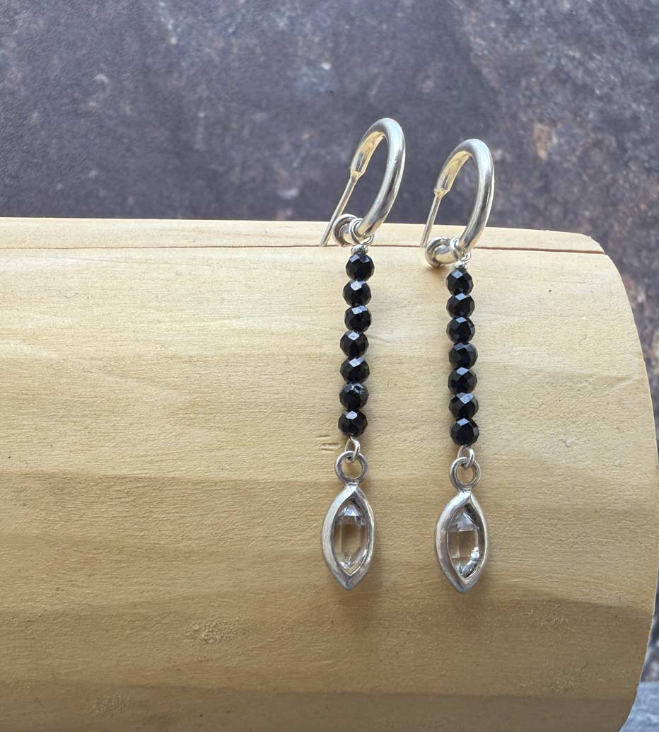 Aros Argolla y Ojiva Plata 950 y Cuarzo Diamante o Herkimer 2cm Mostacillas de Turmalina Negra