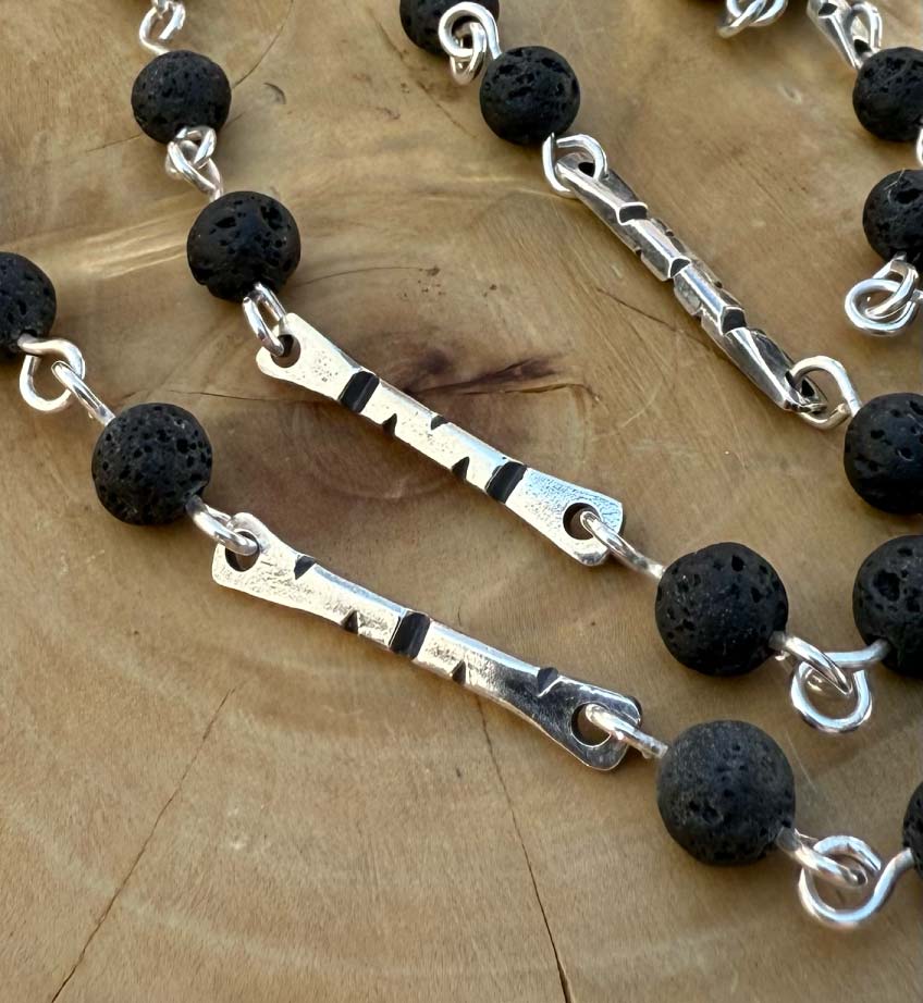 Cadena palitos de plata 950 con zurcos en forma de triangulos y piedras volcánicas entorchadas en alambre de plata 950.