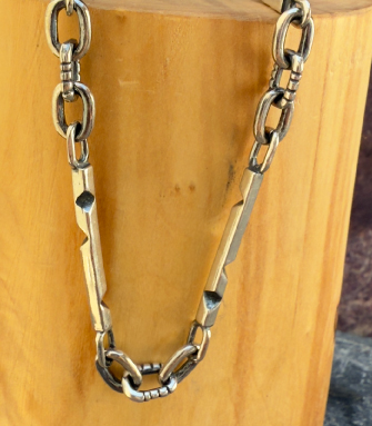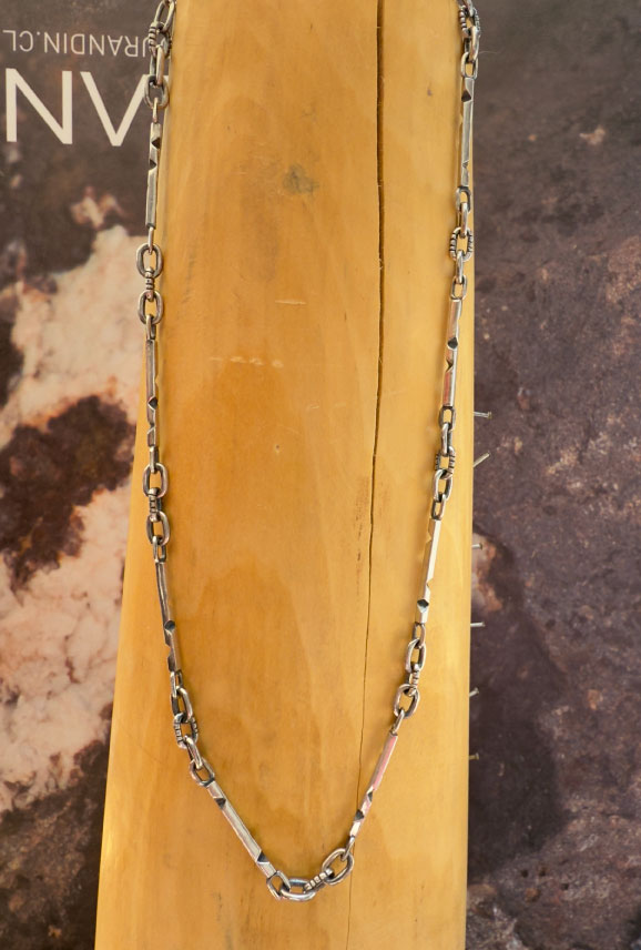 Cadena de plata 950 de palitos de alambre cuadrado con zurcos en forma de triangulos unidos por eslabones.