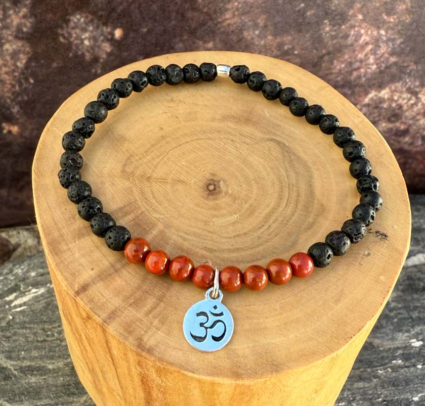 Pulsera Elástica Om Plata 950 y Mostacillas de Jaspe y Piedra Volcánica