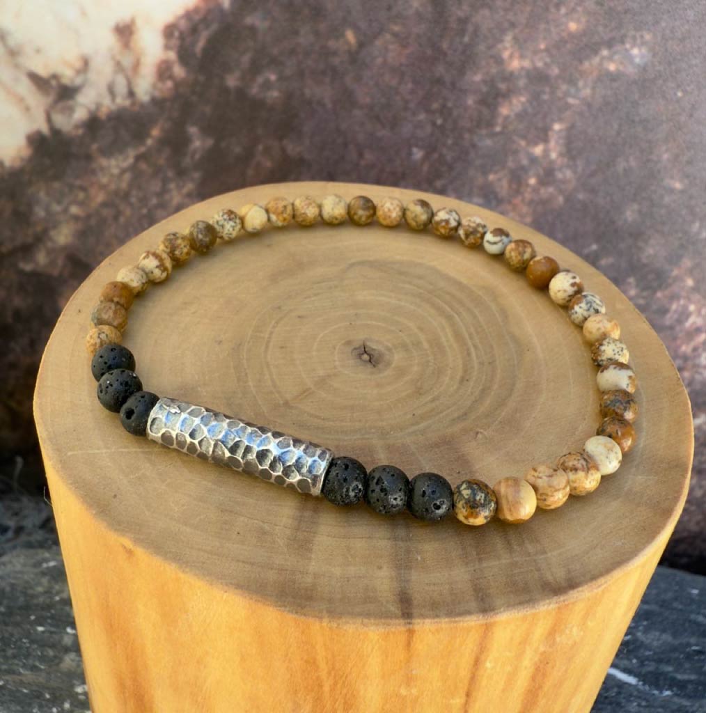Esta pulsera está diseñada con un elástico de silicona de 0.8 mm, lo que garantiza un ajuste cómodo y seguro. NO es ajustable y tiene una medida de aprox 19cm para una muñeca que mida entre 17cm que quedaría con bastante holgura a 19cm que quedaría con la holgura más ajustada, si no es la medida que buscas sólo escríbeme para hacerme un pedido. Tiene un tubo de plata 950 de 0.5mm de diametro x 2cm de largo con una textura de líneas martilladas y mostacillas de Piedra Volcánica y Jaspe amarillo de 4mm.