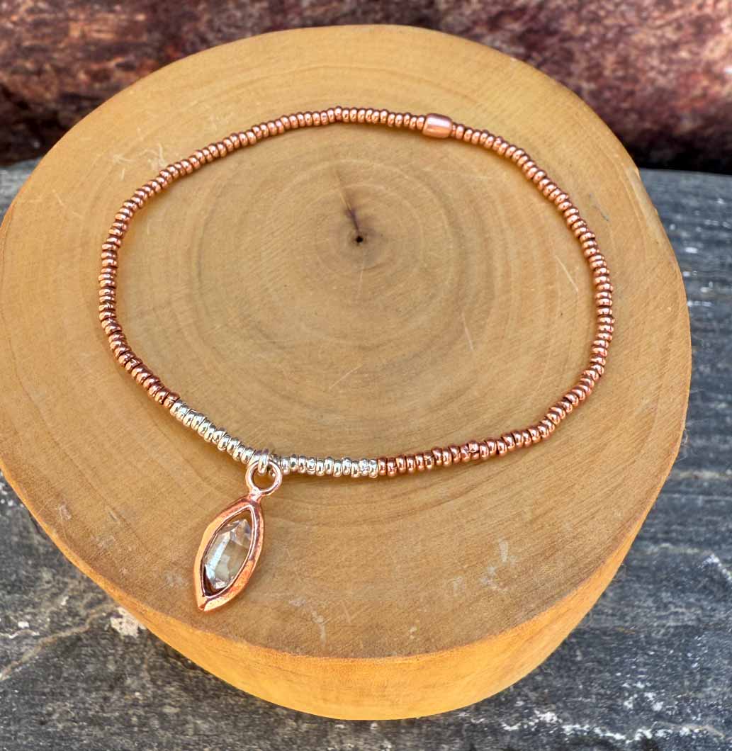 Pulsera Elástica con Mostacillas de Cobre y Plata 1000 con centro de Herkimer y Cobre